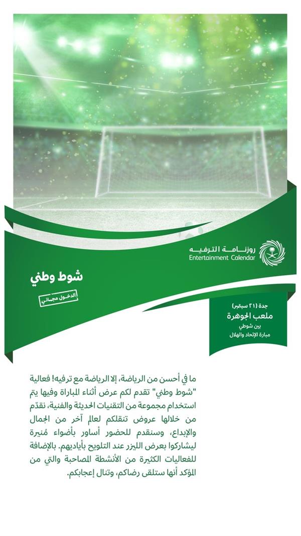 عروس البحر الأحمر جدة ستحتفي هي الأخرى في 21 سبتمبر بملعب الجوهرة، بفعالية "شوط وطني"، التي ستقام بين شوطي مباراة الكلاسيكو السعودي التي تجمع فريقي الاتحاد والهلال، بعروض فنية تفاعلية تستخدم فيها ربطات المعصم المضيئة LED، وعروض الألعاب النارية، وعروض الليزر، في أجواء كرنفالية ترفيهية جذابة لم يسبق تقديمها في احتفالات اليوم الوطني.