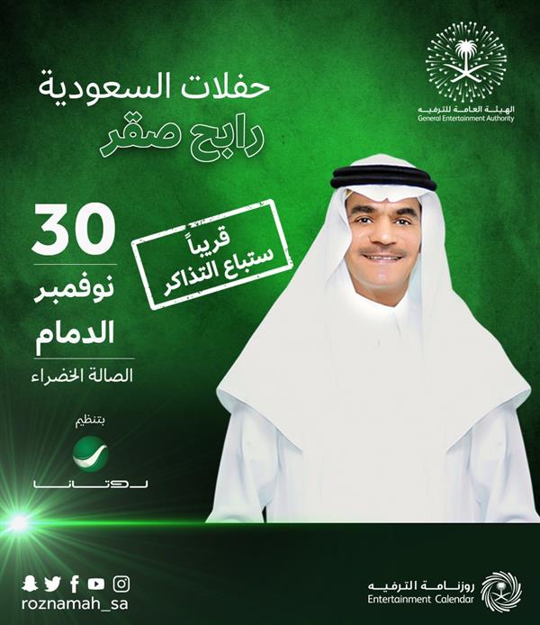 وأشارت إلى أن هناك حفلا غنائيا للفنان رابح صقر، سيقام في مدينة الدمام بالمنطقة الشرقية بتاريخ 30 نوفمبر 2017م.