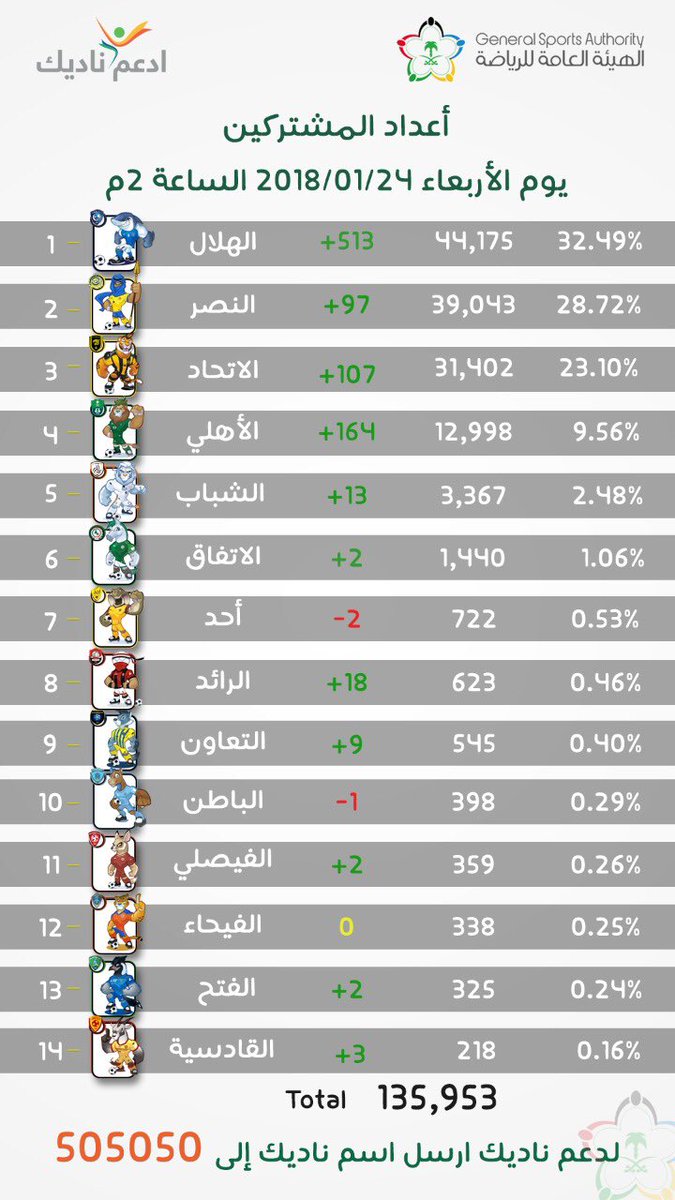 ويتواجد الهلال في المركز الأول برصيد 44175 مشتركاً بعد اشتراك 513 عضوًا له اليوم.