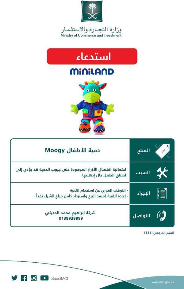 حذّرت وزارة التجارة والاستثمار، اليوم (الثلاثاء)، من استخدام دمية الأطفال "Miniland"، داعيةً المستهلكين إلى التوقف الفوري لاحتمالية انفصال الأزرار، الأمر الذي يؤدي إلى اختناق الطفل حال ابتلاعها.
