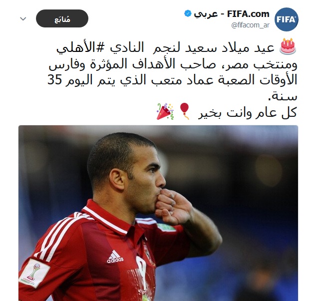 ونشر الاتحاد الدولي عبر حسابه باللغة العربية صورة للنجم المصري، وعلق عليها قائلًا: “عيد ميلاد سعيد لنجم النادي الأهلي ومنتخب مصر، صاحب الأهداف المؤثرة وفارس الأوقات الصعبة عماد متعب الذي يتم اليوم 35 سنة. كل عام وأنت بخير”.