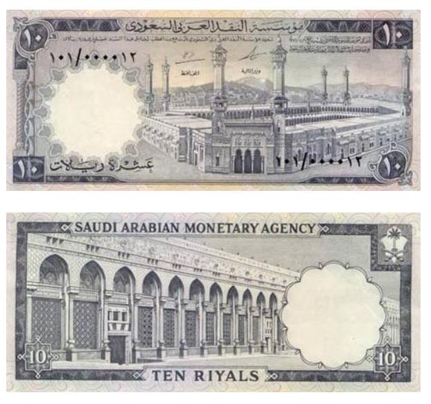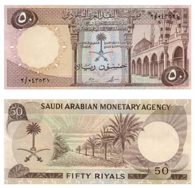 بلون بني ويظهر في الوجه على اليمين صورة داخلية للمسجد النبوي الشريف، أما في الظهر فتم وضع صورة لمزرعة بالخرج.