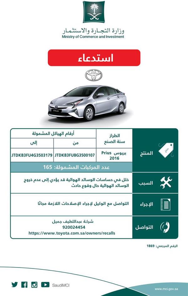 أعلنت وزارة التجارة والاستثمار، اليوم الاثنين، عن استدعاء 165 مركبة تويوتا "بريوس" 2016، بسبب خلل في حساسات الإرباق.
