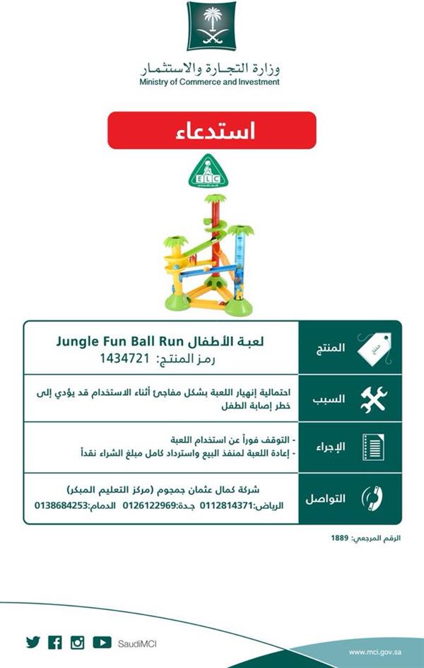 وأعلنت الوزارة، عبر صفحتها الرسمية بـ"تويتر"، استدعاء المنتج لاحتمالية انهيار اللعبة بشكل مفاجئ أثناء الاستخدام، قد يؤدي إلى خطر إصابة الطفل.
