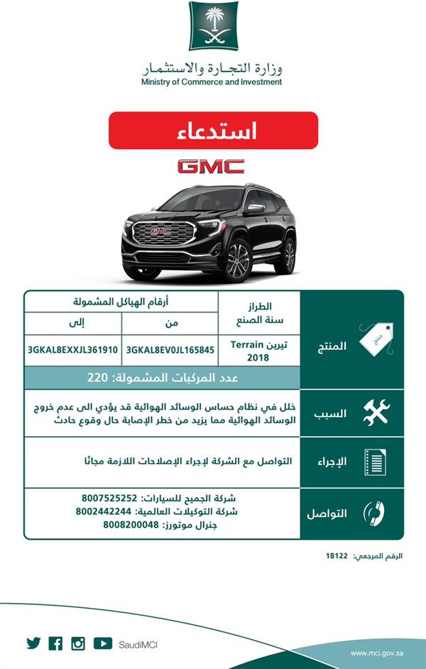 أعلنت وزارة التجارة والاستثمار، اليوم الاثنين، عن استدعاء 220 مركبة من نوع "GMC/ Terrain" موديل 2018، وذلك لوجود خلل قد يزيد من خطر الإصابة حال وقوع حادث.