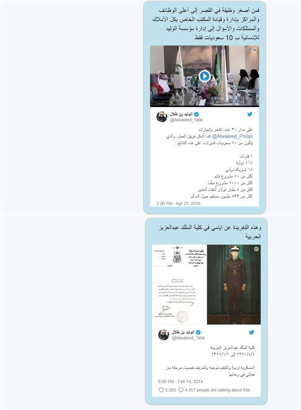 وأوضح أن النساء يتولين إدارة المكتب الخاص بكل الأملاك والممتلكات والأموال، وتدار مؤسسة الوليد للإنسانية بـ 10 سعوديات فقط، وكامل برج المملكة ومدارس المملكة، والمنتجع والمجمع السكني الخاص، وإدارة الخدمات المساندة، وإدارة التموين، وأول كابتن طيار سعودية، وأول 10 مضيفات طيران سعوديات.