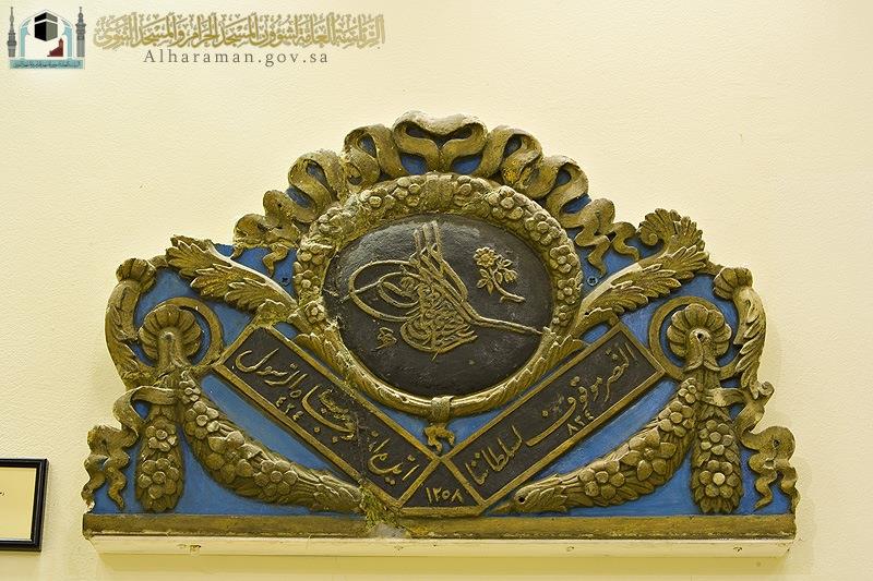 12-من زخارف المسجد الحرام، زخرفة على الرخام مذهبة يعود تاريخها لعام 1258هـ كانت مثبتة في أروقة المسجد الحرام.
