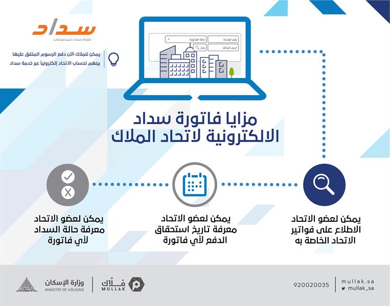 أطلق برنامج "اتحاد الملاك" التابع لوزارة الاسكان إمكانية دفع اشتراك الاتحاد عبر خدمة "سداد"، وذلك من خلال زيارة البوابة الإلكترونية التفاعلية للاتحادات لمعرفة خطوات السداد، حيث تساهم هذه الخطوة في تسهيل عملية جمع مستحقات الملاك وشاغلي الوحدات العقارية ذات الملكية المشتركة.