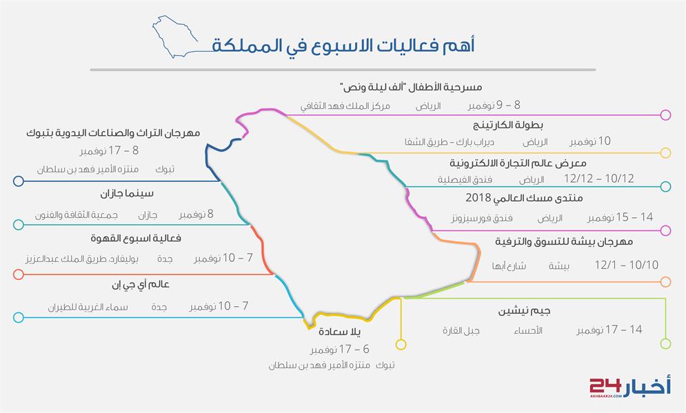 تحتضن كل من "الرياض، وجدة، وبيشة، والأحساء، والخبر، وتبوك، وجازان" بداية من اليوم الخيمس 8 نوفمبر 2018 عدداً من الفعاليات الترفيهية.