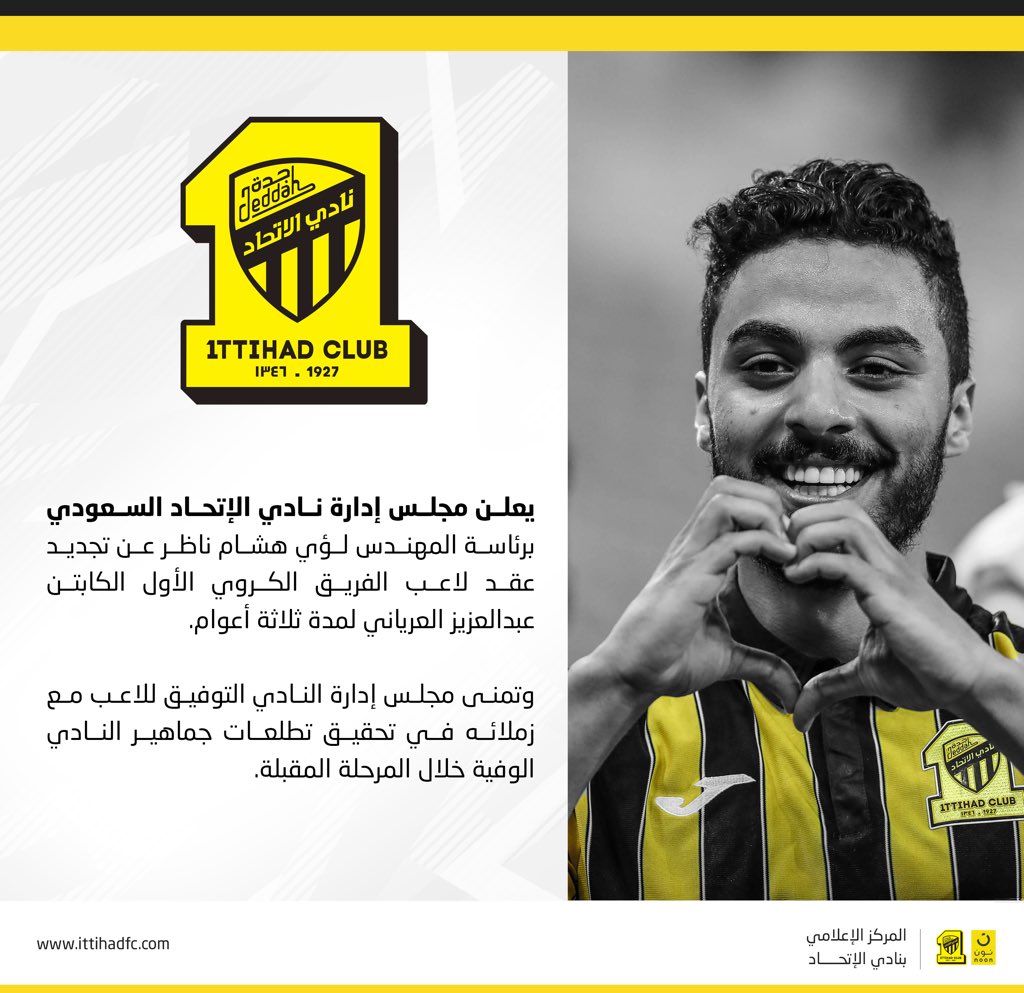 أعلن مجلس إدارة نادي الاتحاد برئاسة لؤي ناظر، تجديد تعاقد مهاجم الفريق عبدالعزيز العرياني لمدمة 3 مواسم إضافية.