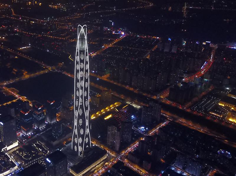 9- مركز تيانجين المالي: يقع هذا المركز المتوقع اكتمال تشييده هذا العام في منطقة تيانجين للتطوير الاقتصادي والتكنولوجي في الصين، ويبلغ ارتفاعه 530 مترًا، ويتكون من 97 طابقًا، وسوف يحتوي المبنى عند اكتماله على مكاتب، و300 شقة خدمية، وفندق خمس نجوم يضم 350 غرفة، وقد تم تصميم المشروع الذي يمتد على مساحة 390 ألف متر مربع وفقًا لمعايير " LEED" والتي تعني " القيادة في الطاقة والتصميم البيئي"، والتي تنطوي على استراتيجيات الاستدامة مثل دخول الضوء الصباحي إلى المبنى والمساحات الخضراء.