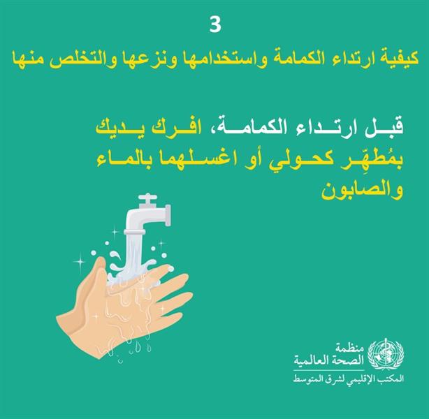 وأكدت المنظمة الدولية أنه عند ارتداء الكمامة يجب معرفة الكيفية السليمة لاستخدامها والتخلص منها.