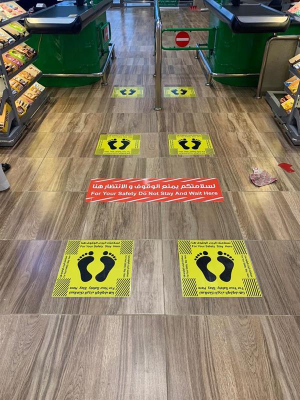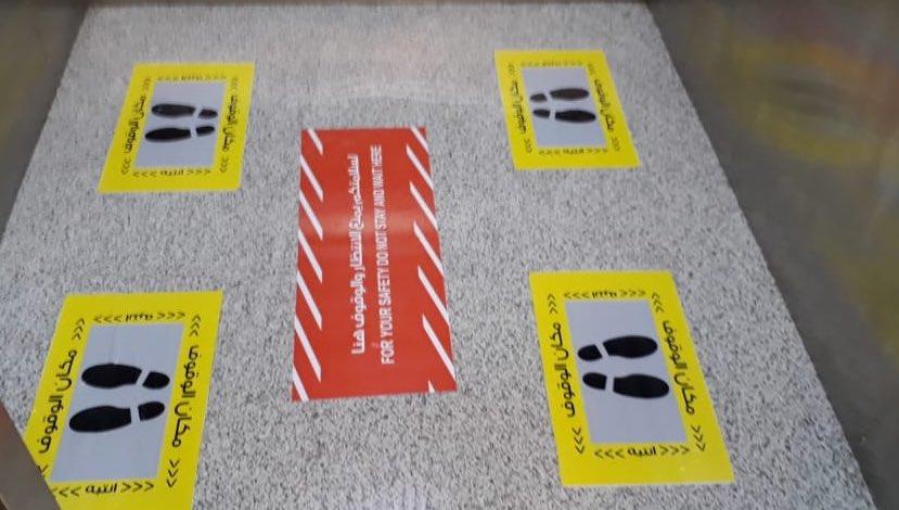 ووضعت الأمانة إشارات أرضية في المراكز التموينية وفي المرافق العامة توضح مقدار المسافة الواجب تركها بين الأشخاص.