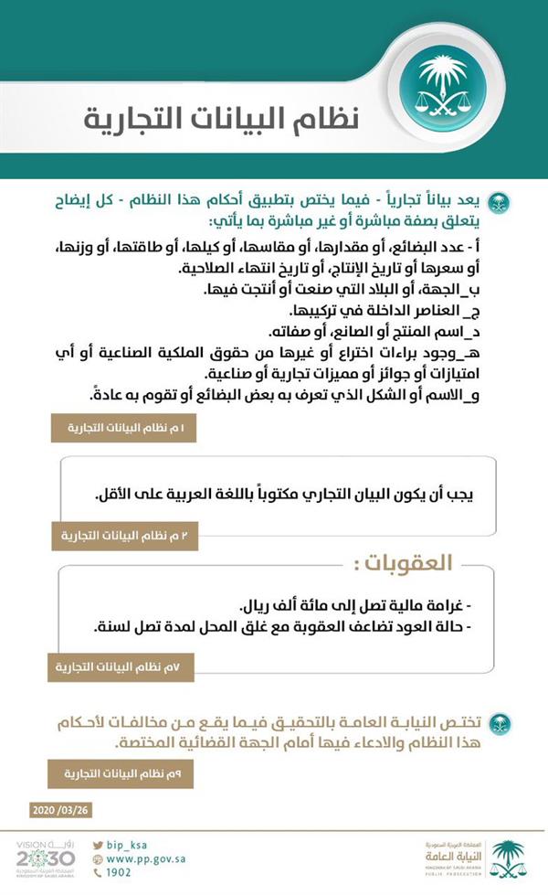 حذرت النيابة العامة من اغتنام أي تداعياتٍ في ممارسات مُجرَّمة للإخلال بأي من المعلومات الواردة في نظام البيانات التجارية للسلع والخدمات.