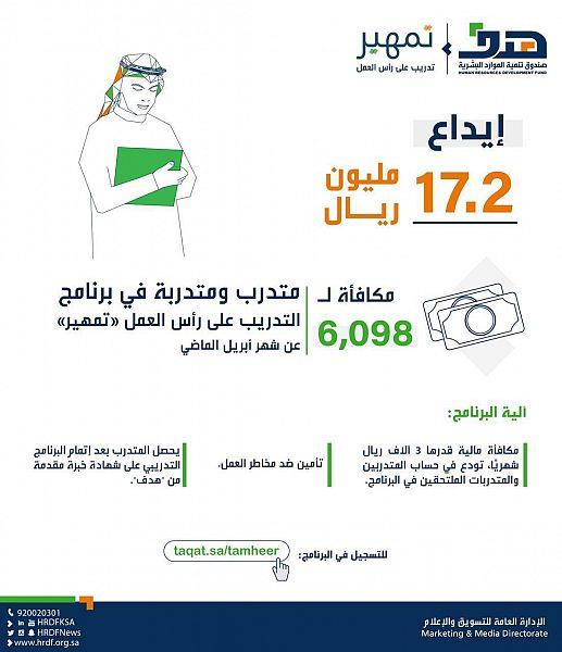 أعلن صندوق تنمية الموارد البشرية "هدف"، اليوم (الأحد)، عن إيداع 17.2 مليون ريال مكافأة عن شهر أبريل الماضي، لأكثر من 6 آلاف متدرب ومتدربة في برنامج التدريب على رأس العمل "تمهير".