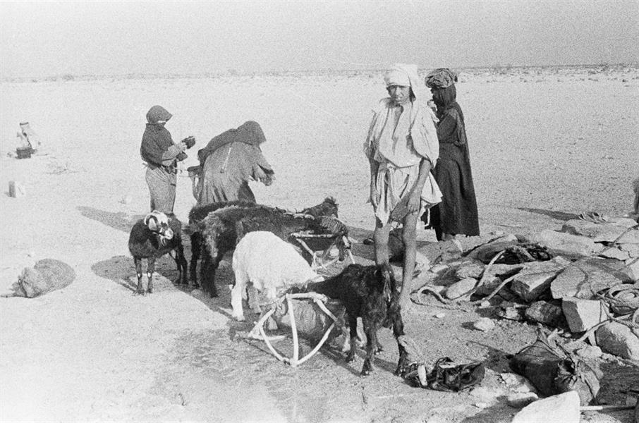 11- أسرة تسقي أغناماً وماعزاً من بئر بجوار قلعة بيشة