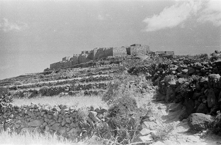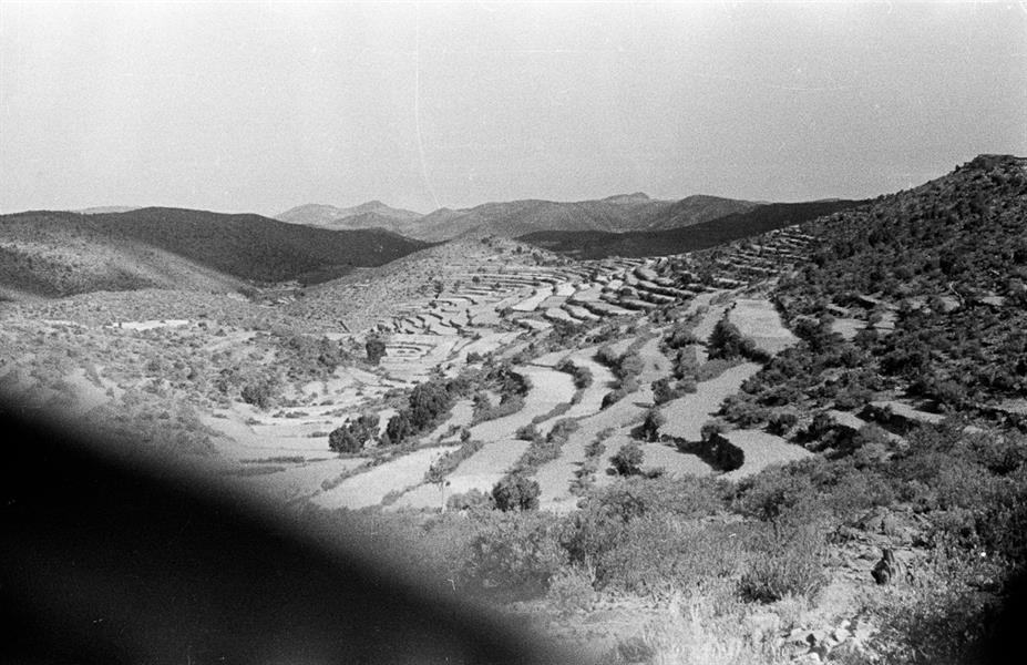 2- صورة من أسفل الحقول المدرجة على جانب التل في نفس القرية، وتظهر أعلى الصورة المباني الحجرية