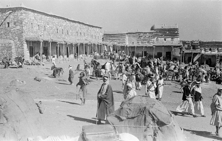 4- صورة للسكان والتجار في سوق أبها في ساحة محاطة بمبنيين من طابقين، وتبدو بعض البضائع مغطاة ومربوطة