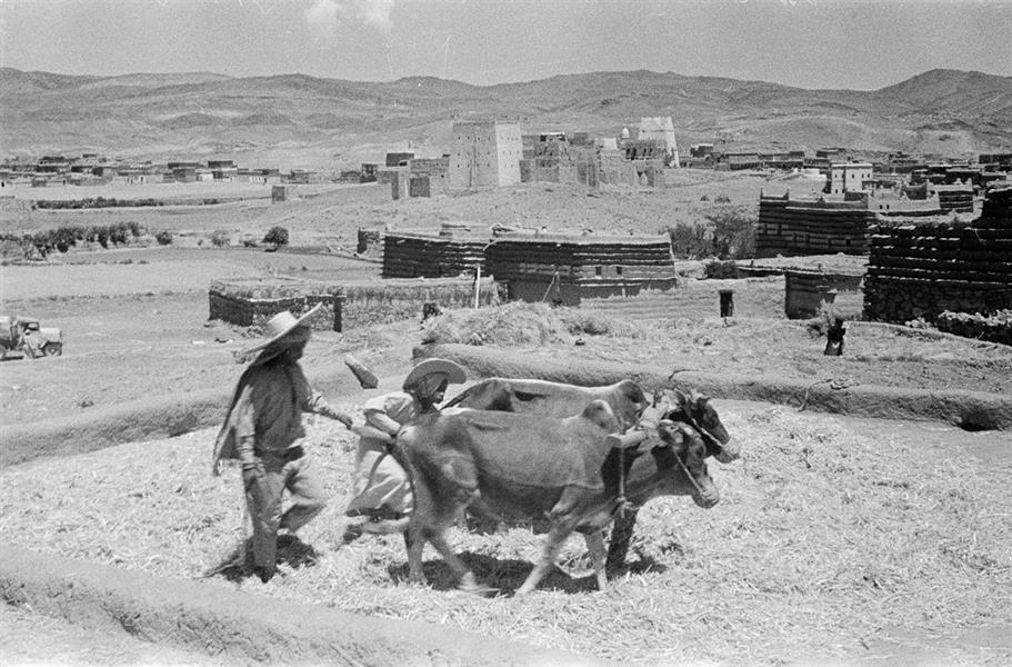 8- رجل وصبي يدرسان القمح (يفصلان الحب عن القش) بالاستعانة بزوج من الأبقار خارج أبها التي تبدو في الخلفية