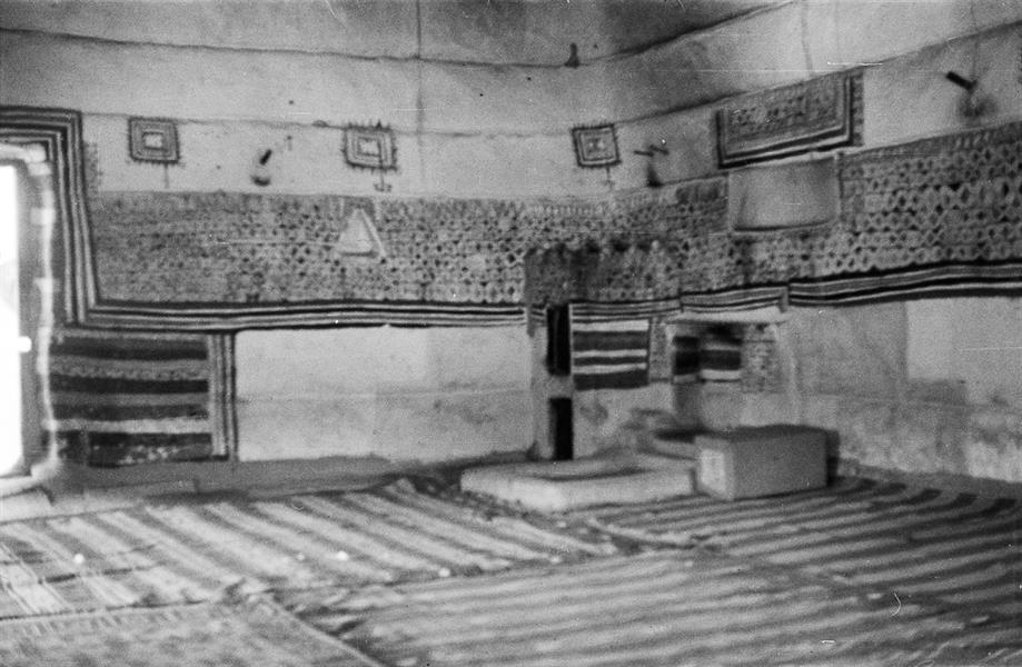 15- غرفة في منزل بقلعة بيشة، الجدران مطلية بأنماط وخطوط، والأرضية مغطاة بسجاد، ويبدو موقد القهوة في أرضية الغرفة