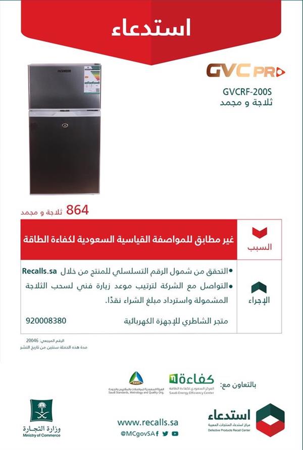 وقالت الوزارة إن الثلاجات والمجمدات المستدعاة ماركة "GVC PRO"، داعية المستهلكين للتحقق من شمول الرقم التسلسلي للمنتج من خلال الدخول إلى الرابط Recakks.com.