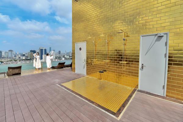 وطُلي الفندق بالذهب عيار 24 من الخارج والداخل، بما في ذلك البهو وحوض السباحة والأثاث والمغسلة والغرف والمراحيض وأواني الطعام ومقابض الأبواب والشبابيك والمرايا.