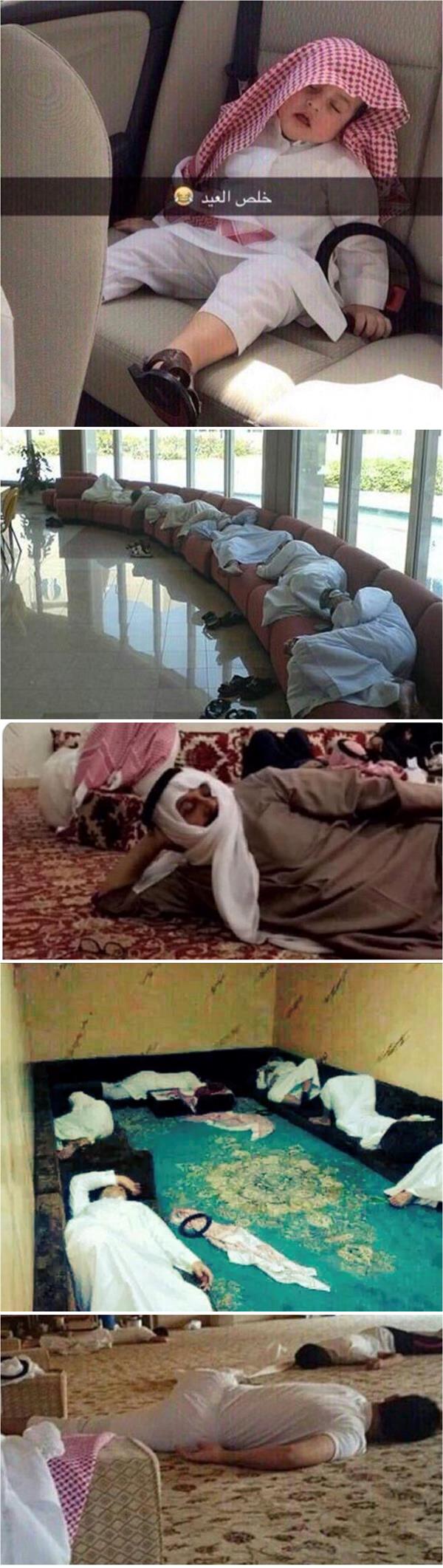 ورغم التزام البعض بتهنئة العيد لأسرهم وأقاربهم وكبار السن إلا أنهم سريعاً ما فزعوا إلى النوم بعد سهر طويل وإرهاق ليلة العيد، وظهر ذلك في الصور والمقاطع الطريفة التي عبرت عما يشعرون به من "غيبوبة" يعجزون معها على مواصلة الاستيقاظ.