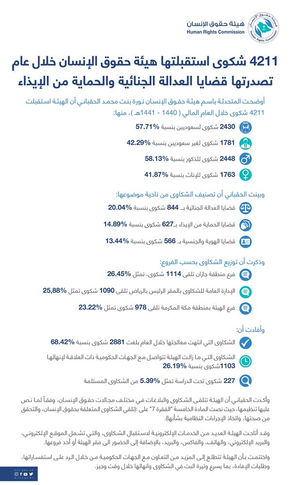 كشفت هيئة حقوق الإنسان عن استقبالها لـ 4211 شكوى خلال العام المالي 1440- 1441هـ، لافتة إلى أن قضايا العدالة الجنائية والحماية من الإيذاء جاءت في الصدارة.