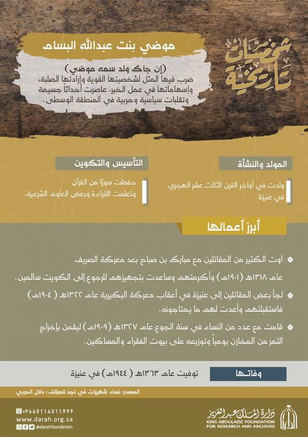 نشرت دارة الملك عبدالعزيز نبذة عن السيدة موضي بنت عبدالله البسام، والتي كان لها دور بارز في إيواء المقـاتلين بعد معركتي الصريف والبكيرية وسنة الجوع التي حلت بالجزيرة العربية.