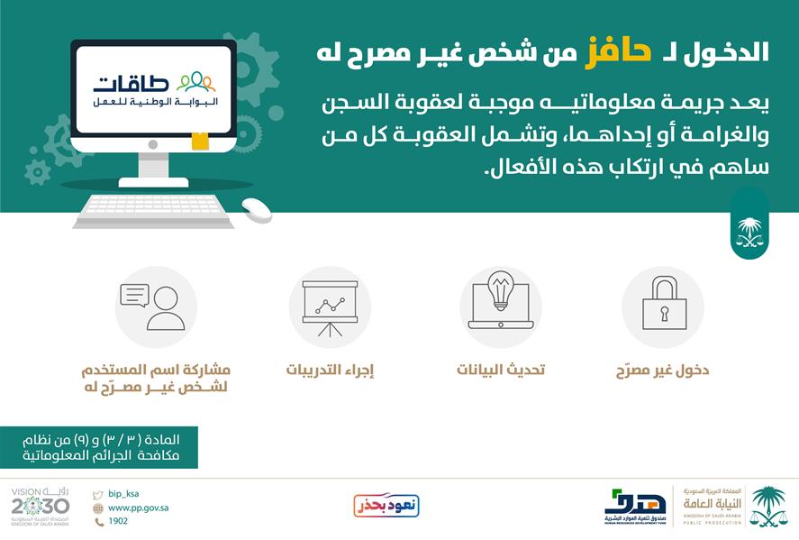 حذرت النيابة العامة من أن محاولة الدخول إلى منصة "حافز" من شخص غير مصرح له تُعد جريمة معلوماتية.