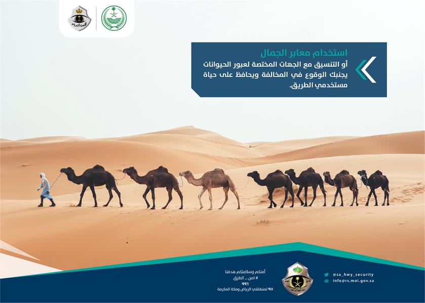 دعت القوات الخاصة لأمن الطرق، مالكي الإبل إلى الحرص على المرور عبر معابر الجمال أو التنسيق مع الجهات المختصة لذلك.