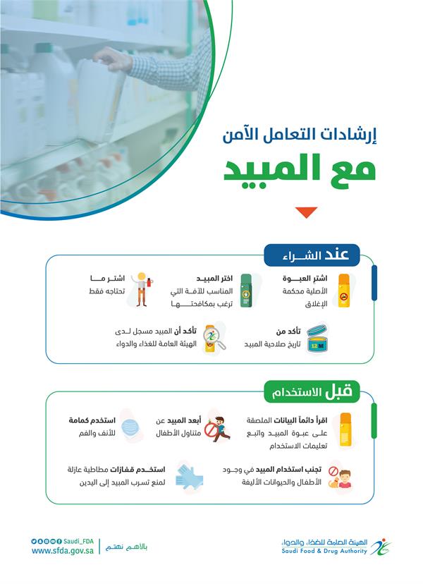 أوصت الهيئة العامة للغذاء والدواء باتباع التعليمات السليمة للتعامل الآمن مع المبيدات المنزلية.