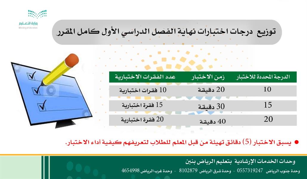 وأبانت الكيفية التي يتم من خلالها توزيع درجات اختبارات نهاية الفصل الدراسي الأول لكامل المقرر.