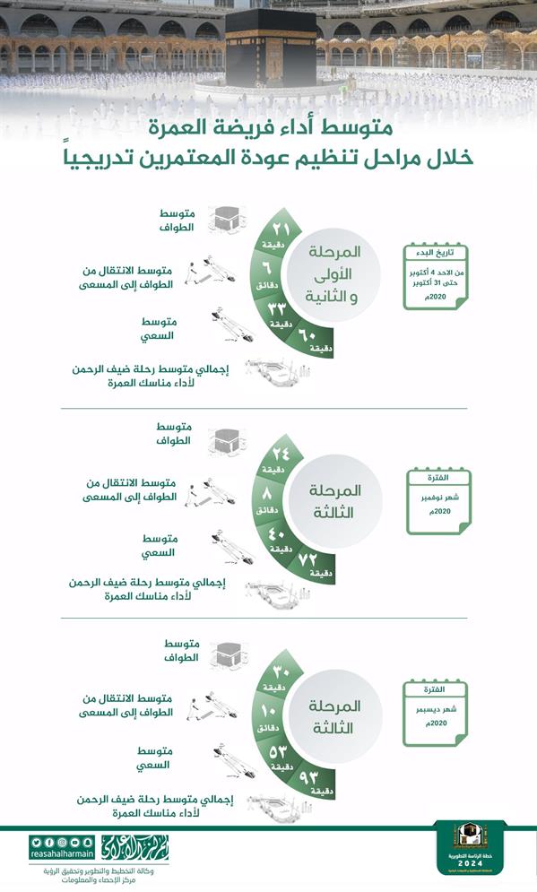 وأوضحت الرئاسة العامة أن المرحلة الأولى والثانية، بداية من 4 أكتوبر وحتى 31 أكتوبر 2020، شهدت متوسط طواف 21 دقيقة، وبلغ متوسط الانتقال من الطواف إلى المسعى 6 دقائق فيما كان متوسط السعي 33 دقيقة، بحيث وصل إجمالي متوسط رحلة أداء مناسك العمرة 60 دقيقة.