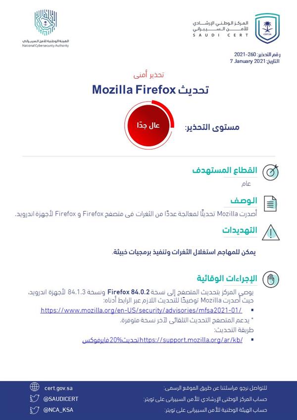 أصدر المركز الوطني الإرشادي للأمن السيبراني، اليوم (الخميس)، تحذيراً عالي الخطورة من ثغرات في متصفح "فايرفوكس" Firefox لأجهزة أندرويد، وFirefox، وFirefox ESR.