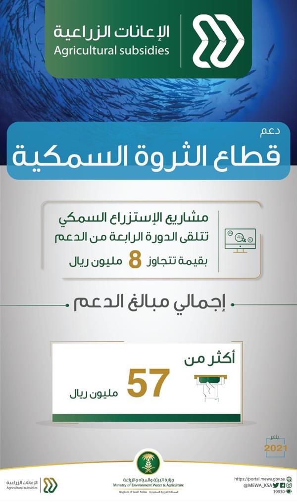 وأشارت إلى أن إجمالي الدعم لقطاع الدواجن بلغ أكثر من 664 مليون ريال، فيما بلغ الإجمالي للثروة السمكية أكثر من 57 مليون ريال.