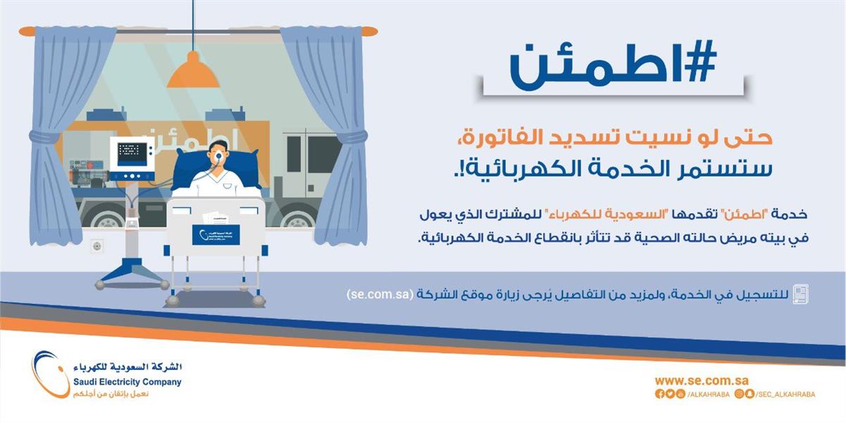 أطلقت الشركة السعودية للكهرباء خدمة "اطمئن" للمشترك الذي يعول في بيته مريضاً تعتمد حياته على أجهزة موصلة بالكهرباء.