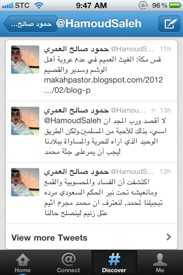 لم يفق الشارع السعودي والاسلامي بعد من تجاوزات حمزة كشغري – الذي هو الآن رهن التحقيق - وتطاوله على الذات الإلهية والرسول الكريم ، حتى غرد في الأفق " التويتري " الشاب حمود صالح العمري وتجرأ في التهجم على الرسول الكريم والإساءة المباشرة لسيد المرسلين .