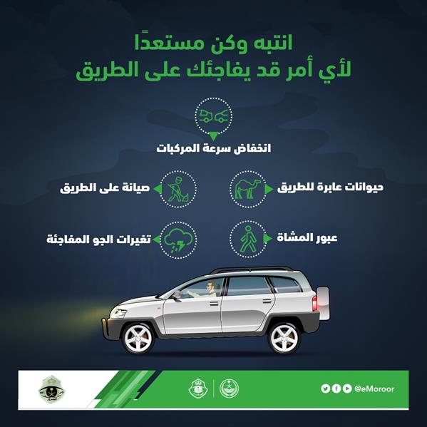 وأشار المرور إلى انخفاض سرعة المركبات على الطريق بشكل مفاجئ، أو عبور مشاة أو حيوانات للطريق، أو وجود صيانة على الطريق، فضلًا عن التغيرات الجوية المفاجئة.