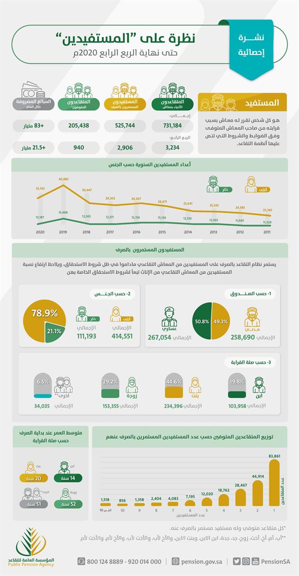 وأوضحت المؤسسة في نشرتها الإحصائية للربع الرابع من العام الماضي، أن إجمالي المستفيدين المستمرين بالصرف يبلغ نحو 526 ألف مستفيد، فيما يبلغ عدد المتقاعدين المتوفين أكثر من 205 آلاف.