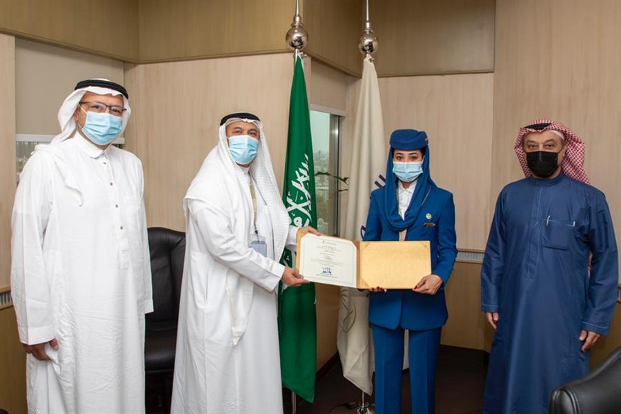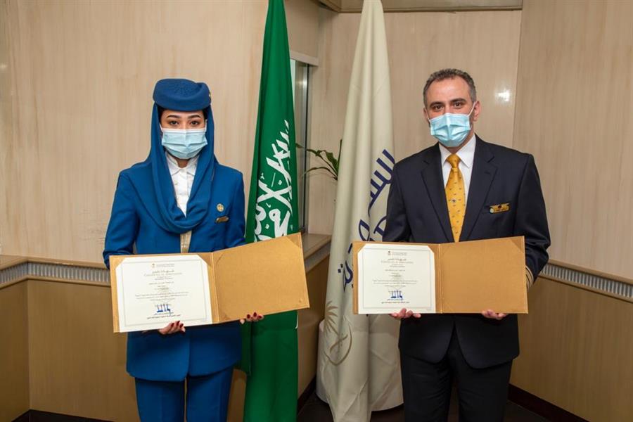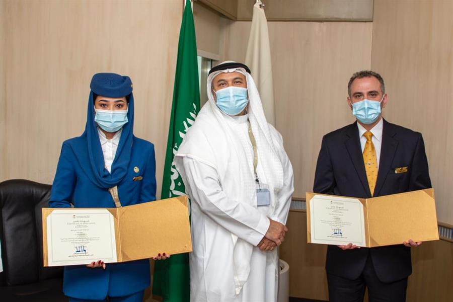 من جهتها، كرمت شركة الخطوط السعودية، الموظفين لتفانيهما في أداء مهامهما، حيث سلم الرئيس التنفيذي للشركة الكابتن إبراهيم الكشي الموظفيْن شهادات تقديرية، مثمناً جهود جميع أفراد طاقم الضيافة الجوية.