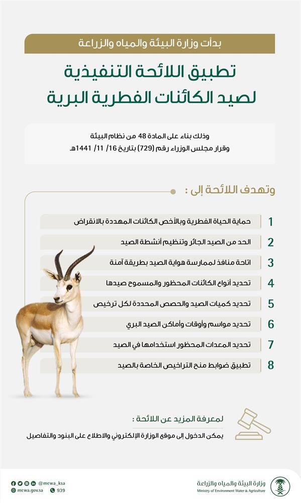 للاطلاع على اللائحة التنفيذية لصيد الكائنات الفطرية الحيوانية البرية