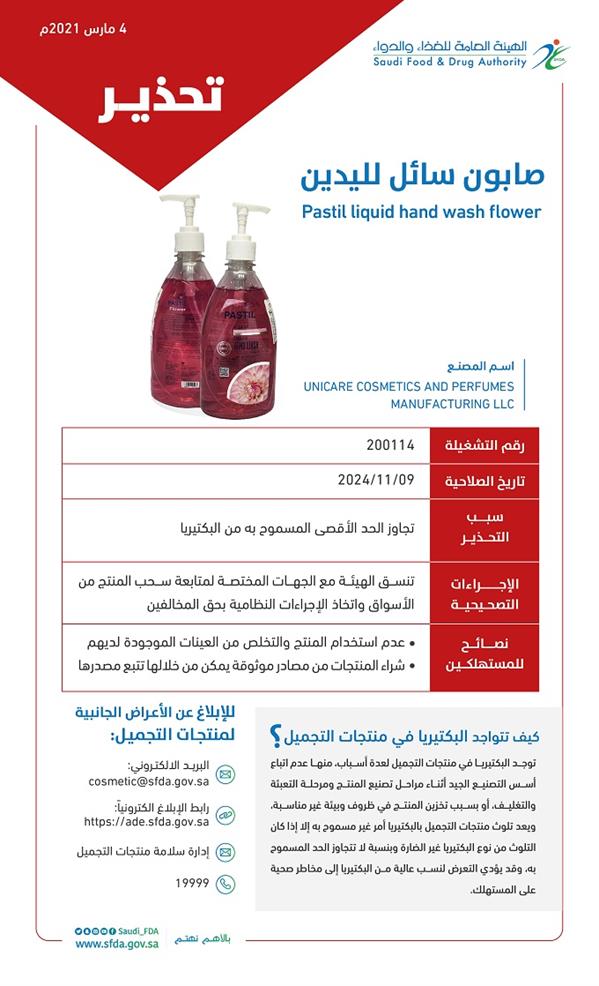 وأشارت إلى أن المنتج يحمل اسم "Pastil liquid hand wash flower"، بتاريخ صلاحية 9/11/2024 ورقم تشغيلة (200114).