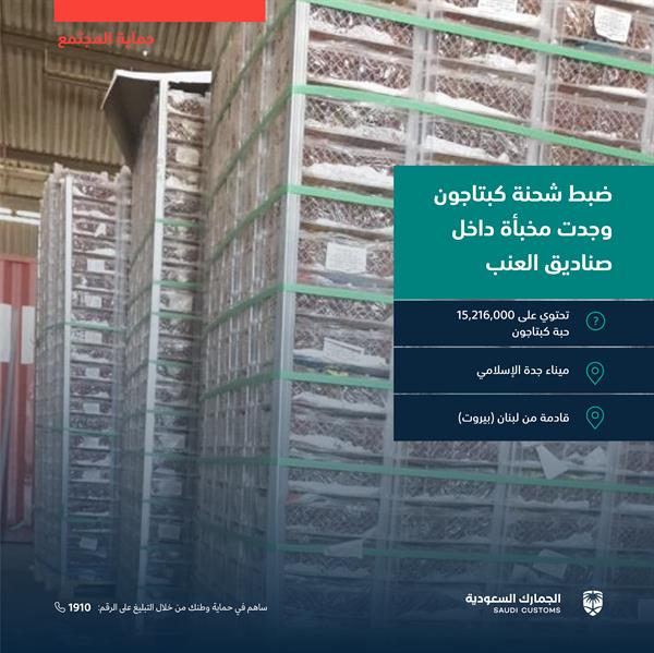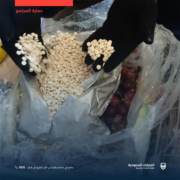 وعثر على الحبوب مخبأة داخل إرسالية "عنب" وردت إلى المملكة من العاصمة اللبنانية بيروت.