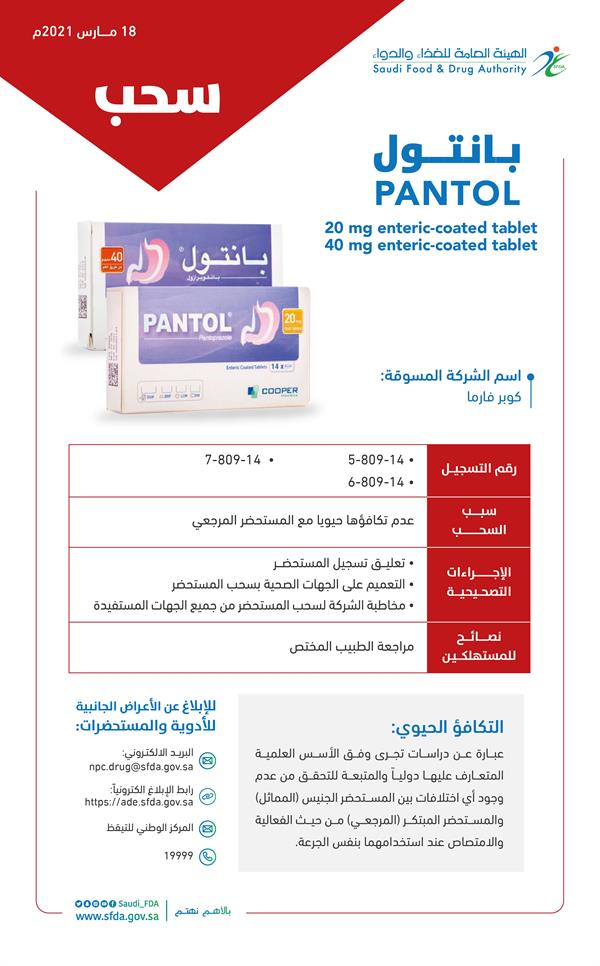 أعلنت الهيئة العامة للغذاء والدواء، اليوم (الخميس)، تعليق تسجيل مستحضر "بانتول" وسحبه لعدم تكافئه حيوياً مع المستحضر المرجعي.