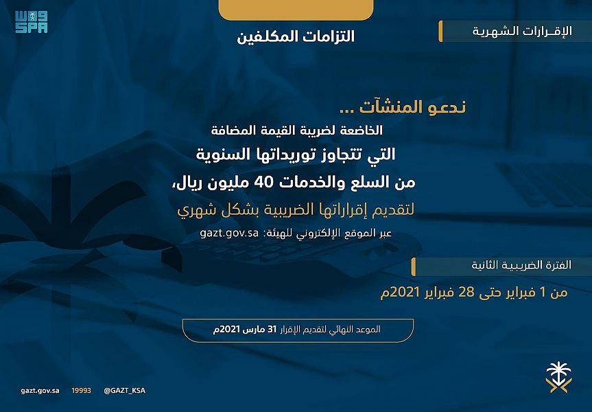 دعت الهيئة العامة للزكاة والدخل المكلفين الخاضعين لضريبة القيمة المضافة إلى تقديم إقراراتهم الضريبية عن شهر فبراير الماضي، وذلك في موعد أقصاه الحادي والثلاثين من شهر مارس الجاري.