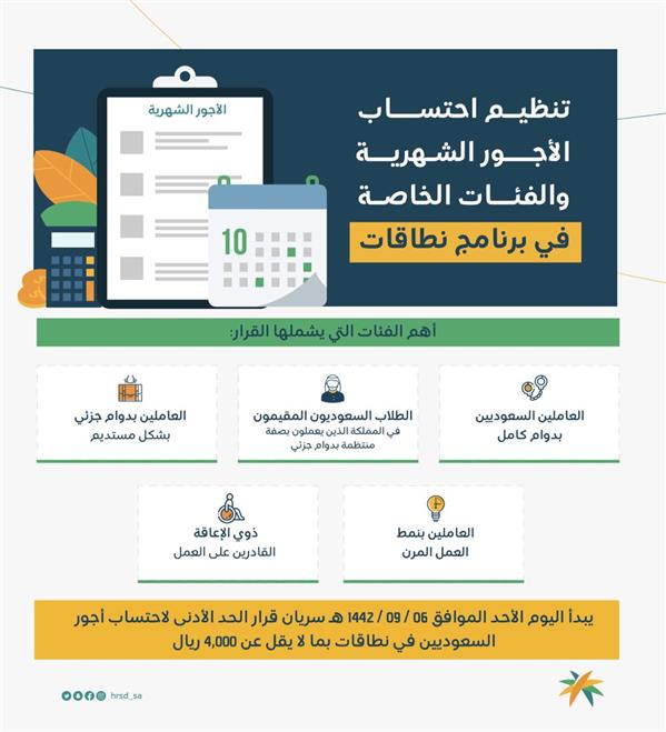 وأوضحت الوزارة أن أهم الفئات التي يشملها القرار هم: العاملون السعوديون بدوام كامل، والطلاب السعوديون المقيمون في المملكة الذين يعملون بصفة منتظمة بدوام جزئي، والعاملون بدوام جزئي بشكل مستديم، والعاملون بنمط العمل المرن، وذوو الإعاقة القادرون على العمل.
