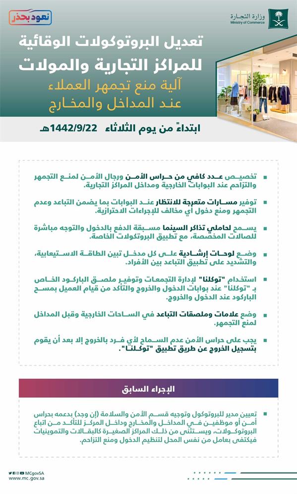 يذكر أن الإجراء السابق كان يتضمن تعيين مدير للبروتوكول وتوجيه قسم الأمن والسلامة إن وجد ودعمه بحراس أمن أو موظفين في المداخل والمخارج وداخل المركز للتأكد من اتباع البروتوكولات، واستثناء من ذلك المراكز الصغيرة والاكتفاء فيها بعامل من نفس المحل لتنظيم الدخول ومنع التزاحم.