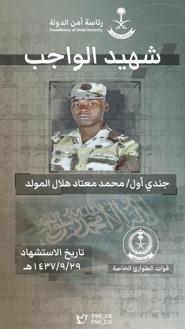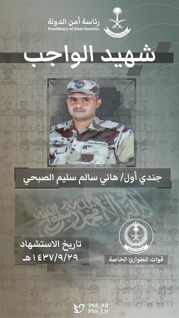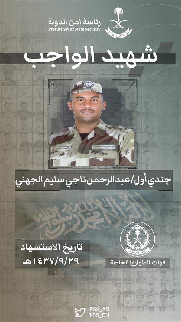 وأبانت الرئاسة أن هؤلاء الأبطال استشهدوا في مثل هذا اليوم من عام 1437هـ، وهم: جندي أول هاني سالم سليم الصبحي، وجندي أول عبدالرحمن ناجي سليم الجهني، وجندي أول محمد معتاد هلال المولد، وجندي أول عبدالمجيد عبدالله عوده الحربي، مبينةً أن جميعهم من قوات الطوارئ الخاصة.