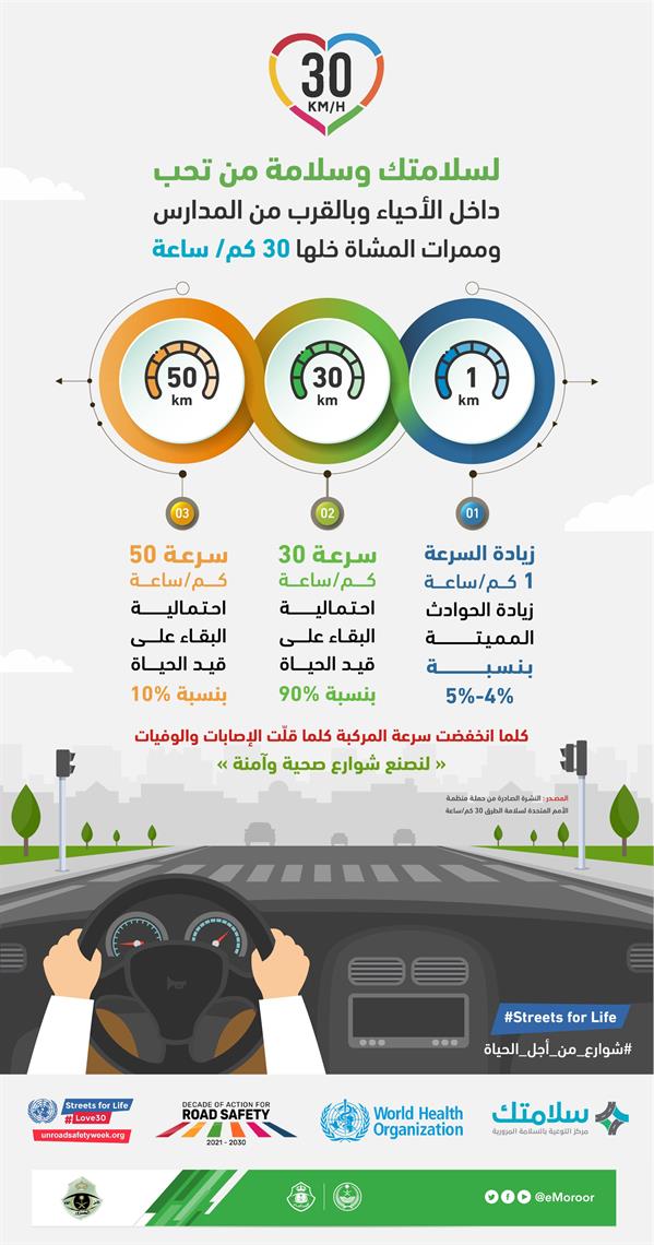 دعا مركز التوعية بالسلامة المرورية (سلامتك) التابع للإدارة العامة للمرور، إلى القيادة على سرعة 30 كيلومتراً في الساعة داخل الأحياء السكنية والمناطق الحضرية وبالقرب من المدارس وممرات المشاة.